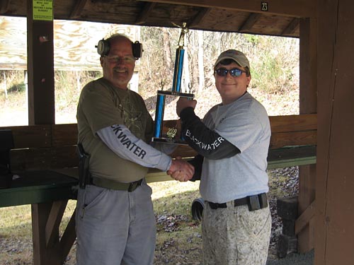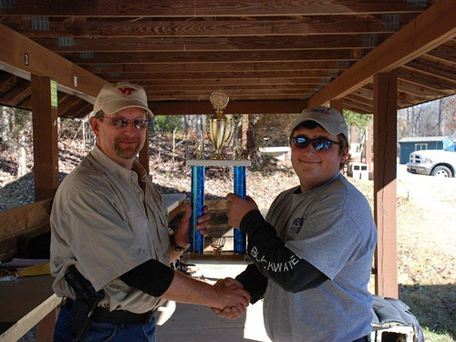 Sonny accepting the trophy from IDPA Committee Chairman, Dave White for winning the Top Gun Match at Rivanna Rifle and Pistol Club in Charlottesville, VA in November of 2009.