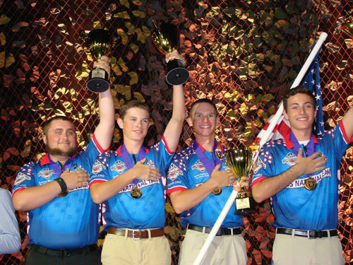 L-R Sonny Morton, Seth Clagg, Jacob Hetherington, and Jason Katz with their Junior Production Team Gold Medals and Trophies from the 2014 IPSC World Shoot.