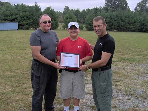 Sonny receiving a Certificate of Achievement from Blackcreek Match Directors Jim Taylor and Anton Kothe for classifying as Master in Stock Service Pistol Division in IDPA at 13 years old on July 19, 2007.